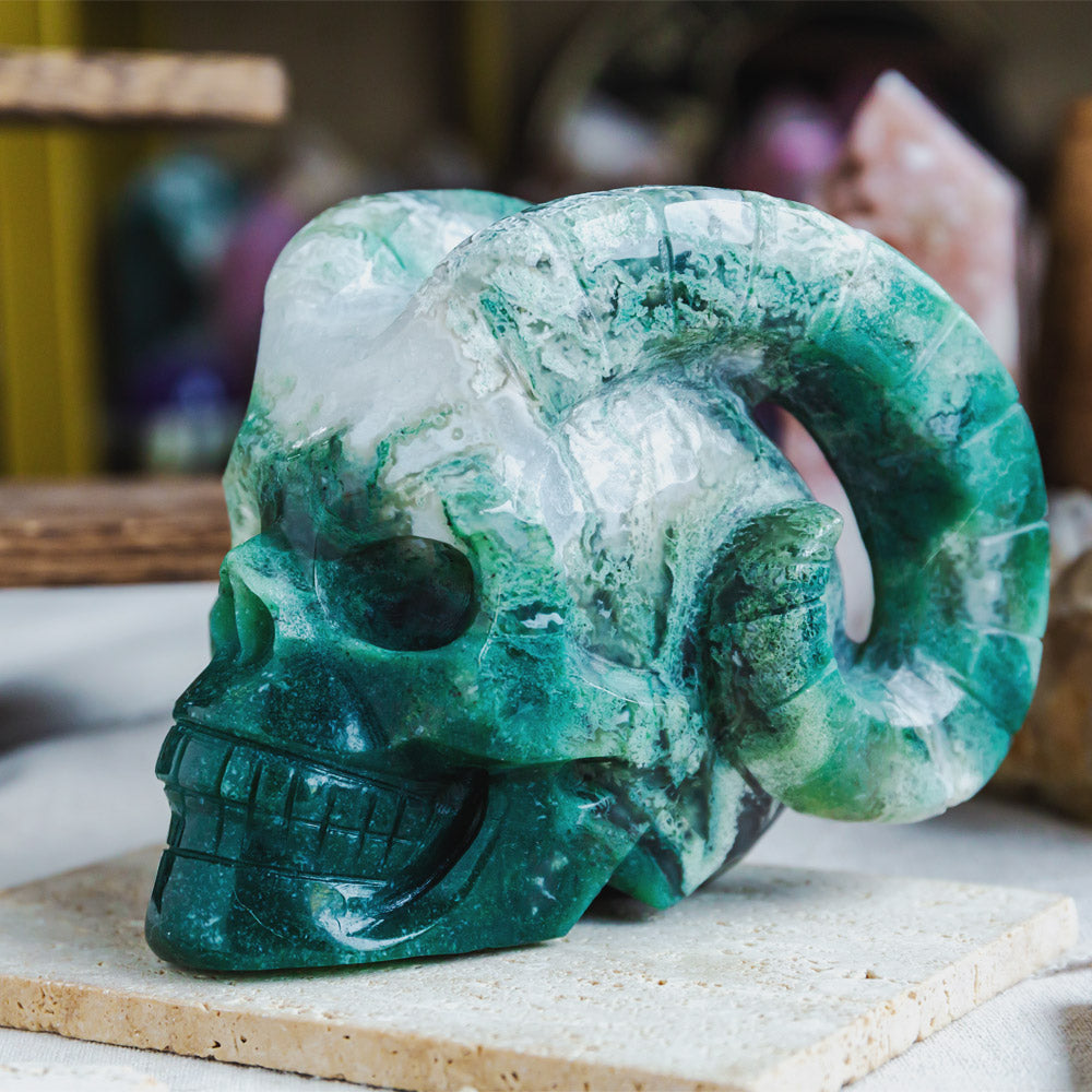 Moss Agate Dinosaur Skull
