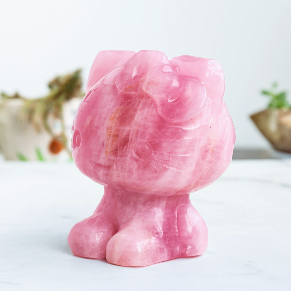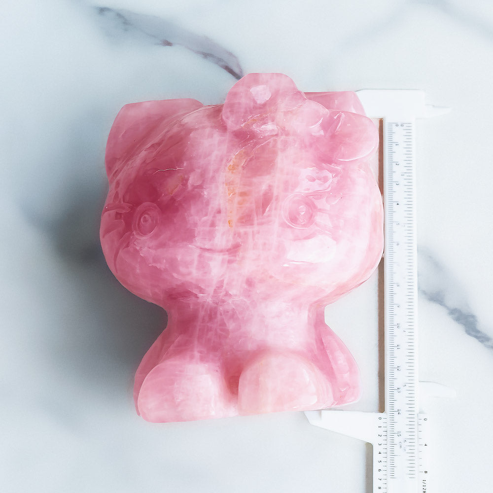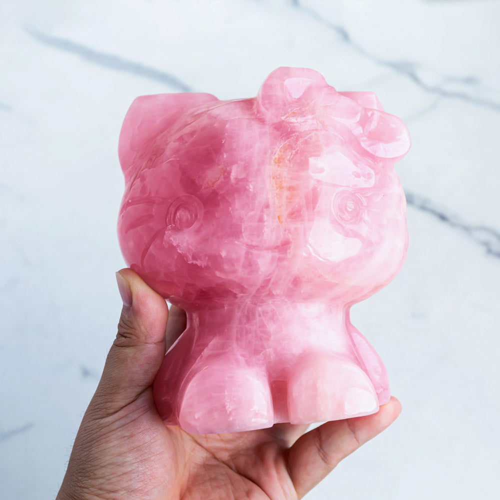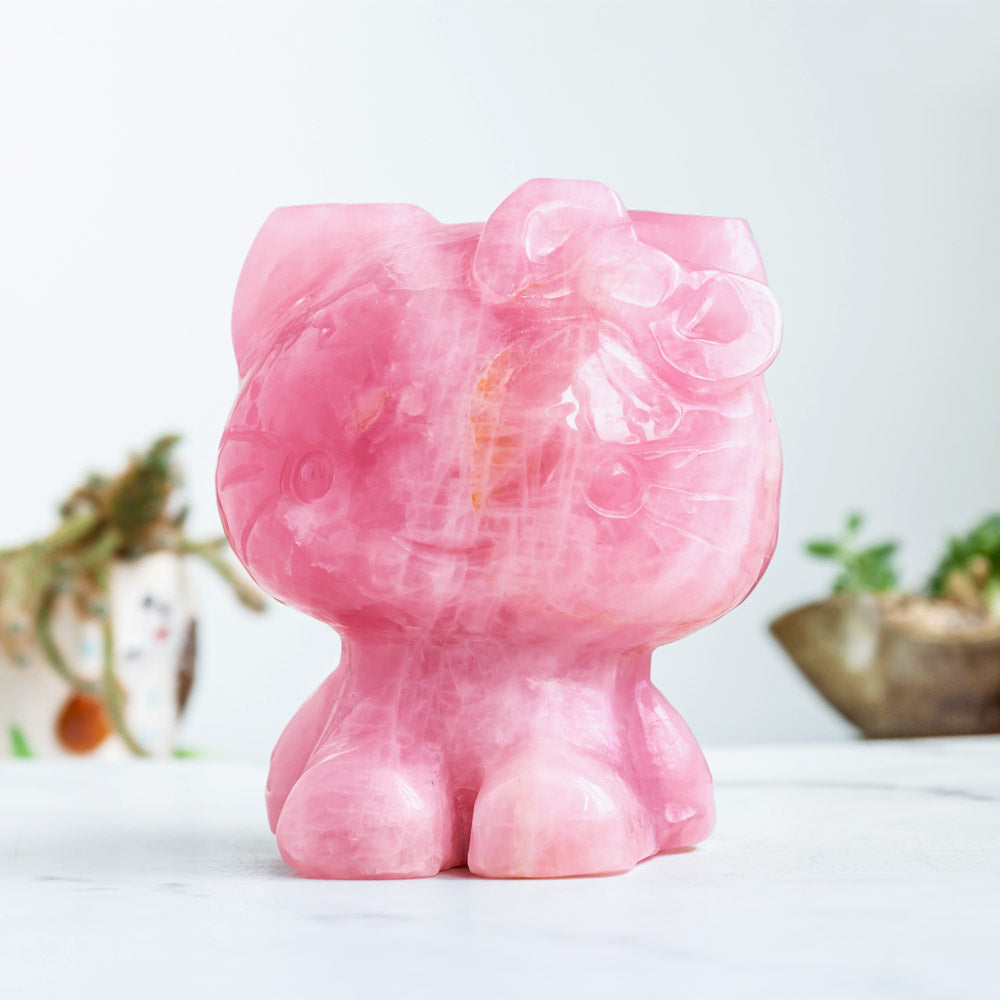 ►This is a super cute, beautifully detailed rose quartz statue of a feminine kitty cat with cute hair bow! The kitty has a sweet expression with big animé-style eyes, and a small bow on its ear. The rose quartz has a soft pink shade with natural color zones—the carving features smooth and appealing shapes, and lustrous surface texture.