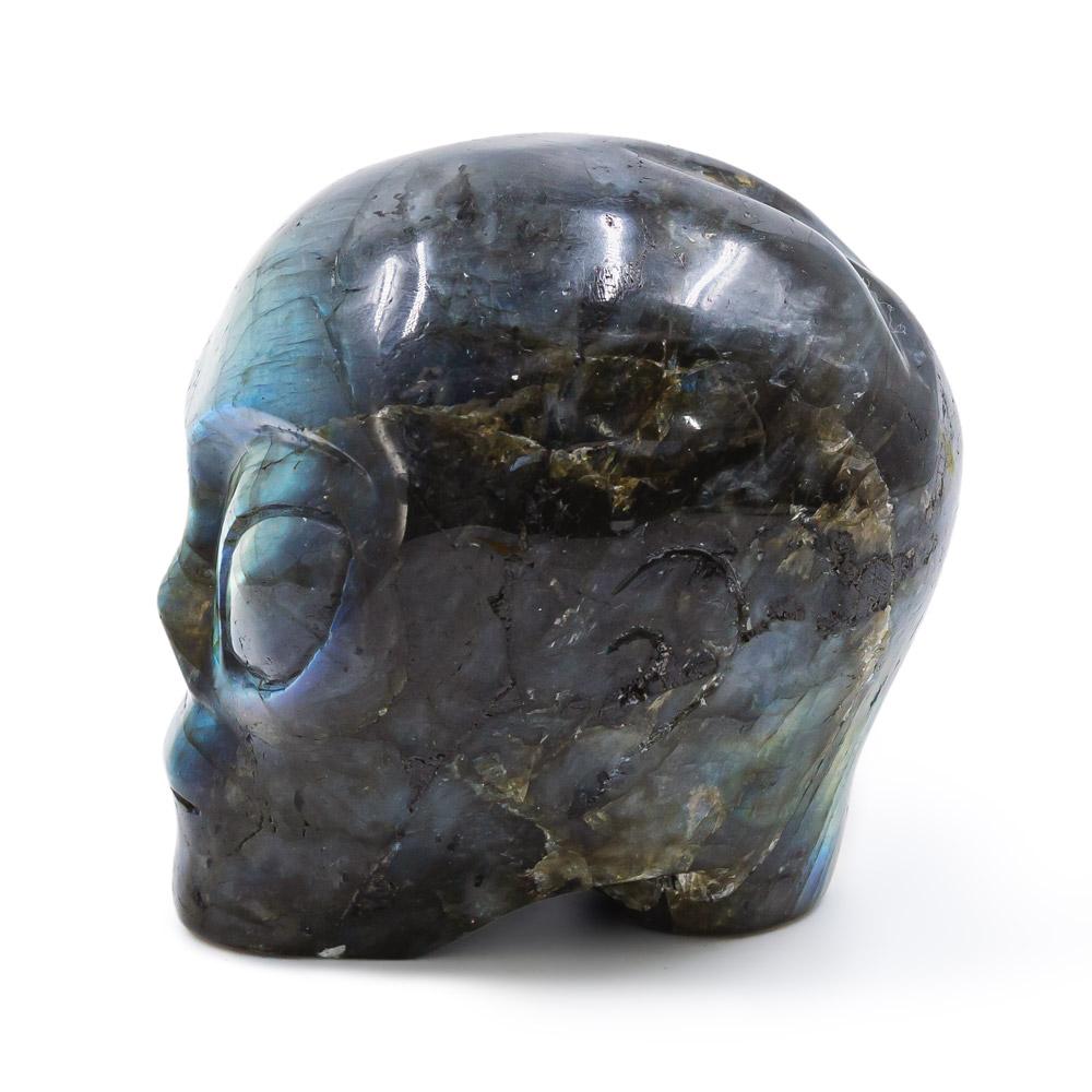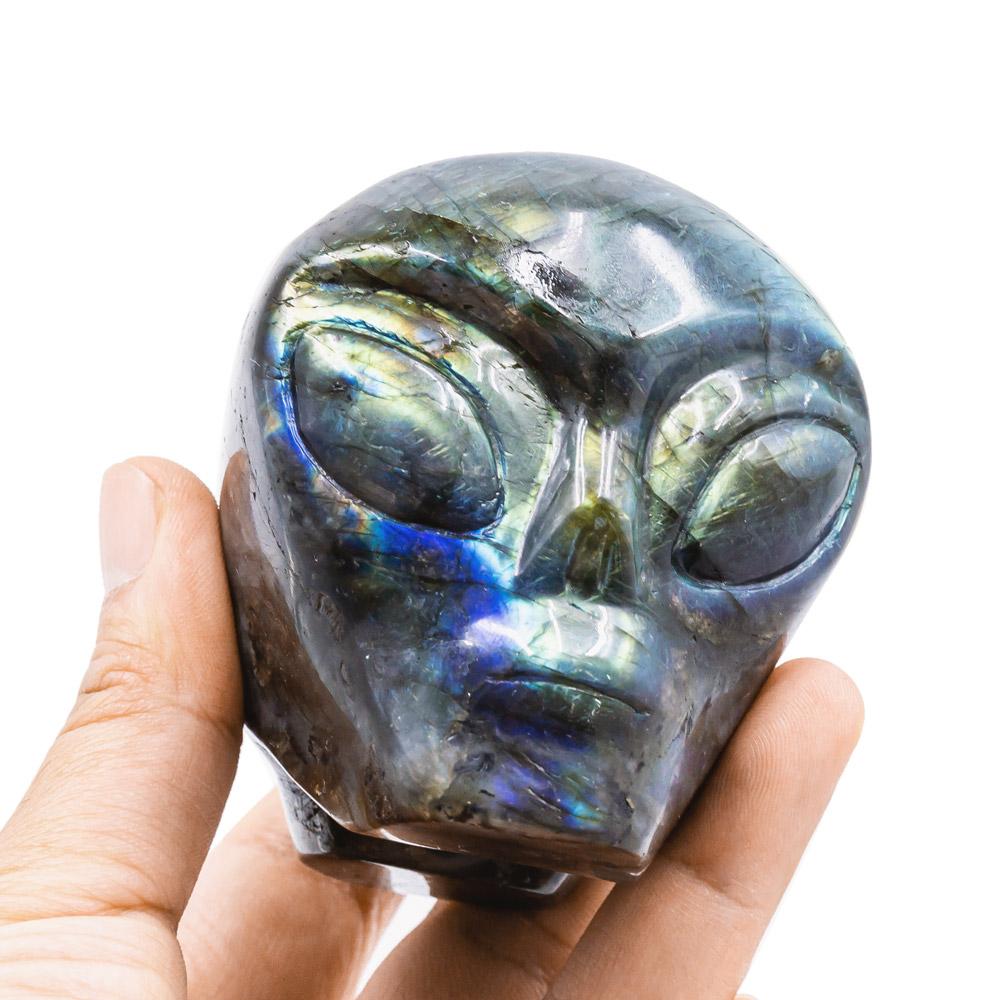 ► Labradorite is a very popular decorative gem. The labradorite alien skull is shimmering with different gloss, green blue or yellow from different angles. The color and brilliance of the same position can move as the stone is rotated. This unique optical effect belongs to natural labradorite.