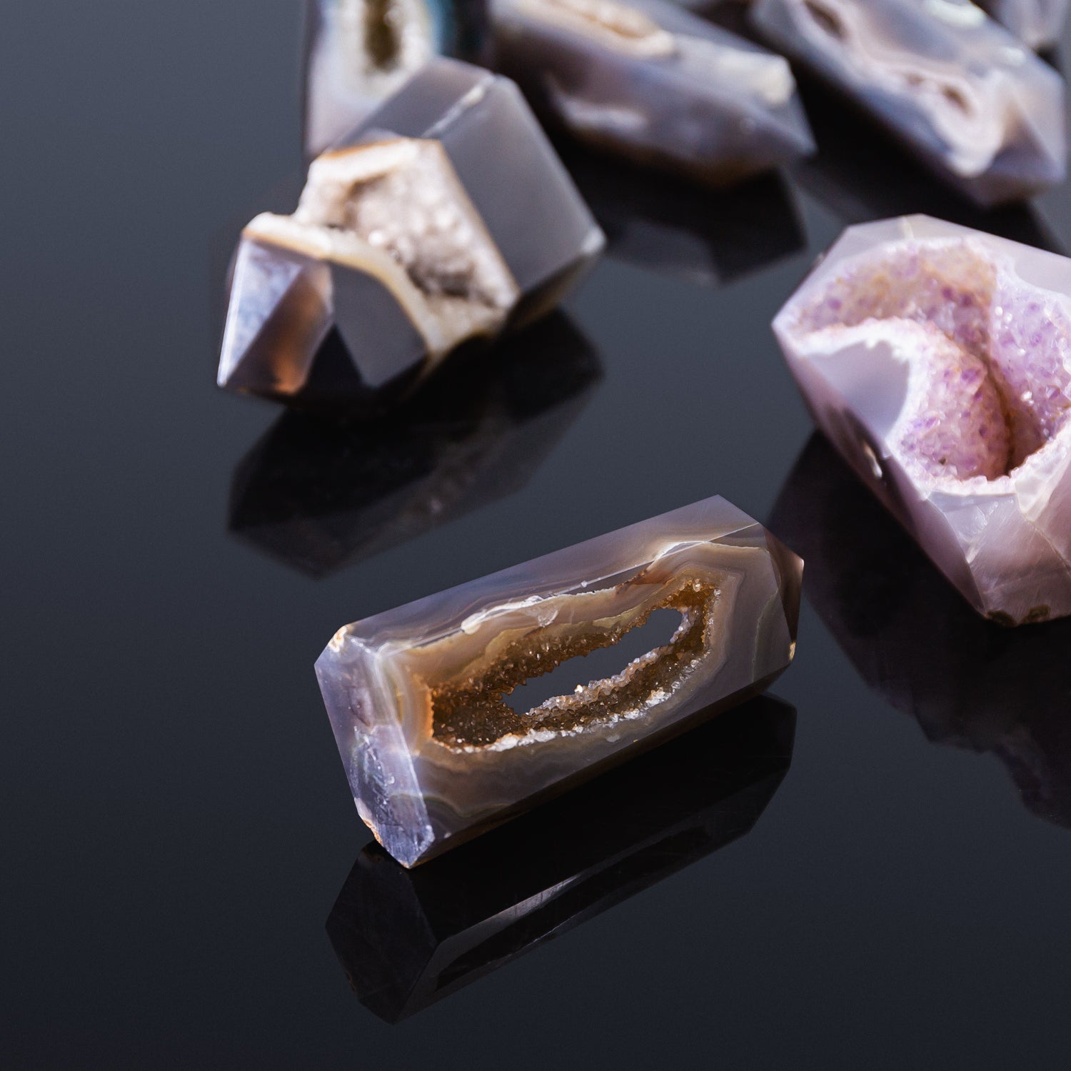 ► Agate geodes are also called cornucopias. The crystal pillars in the agate crystal cave are dense, and the mutual vibration of each other's energy can condense the magnetic field in the house, attracting blessings and blocking evil, auspicious and safe.