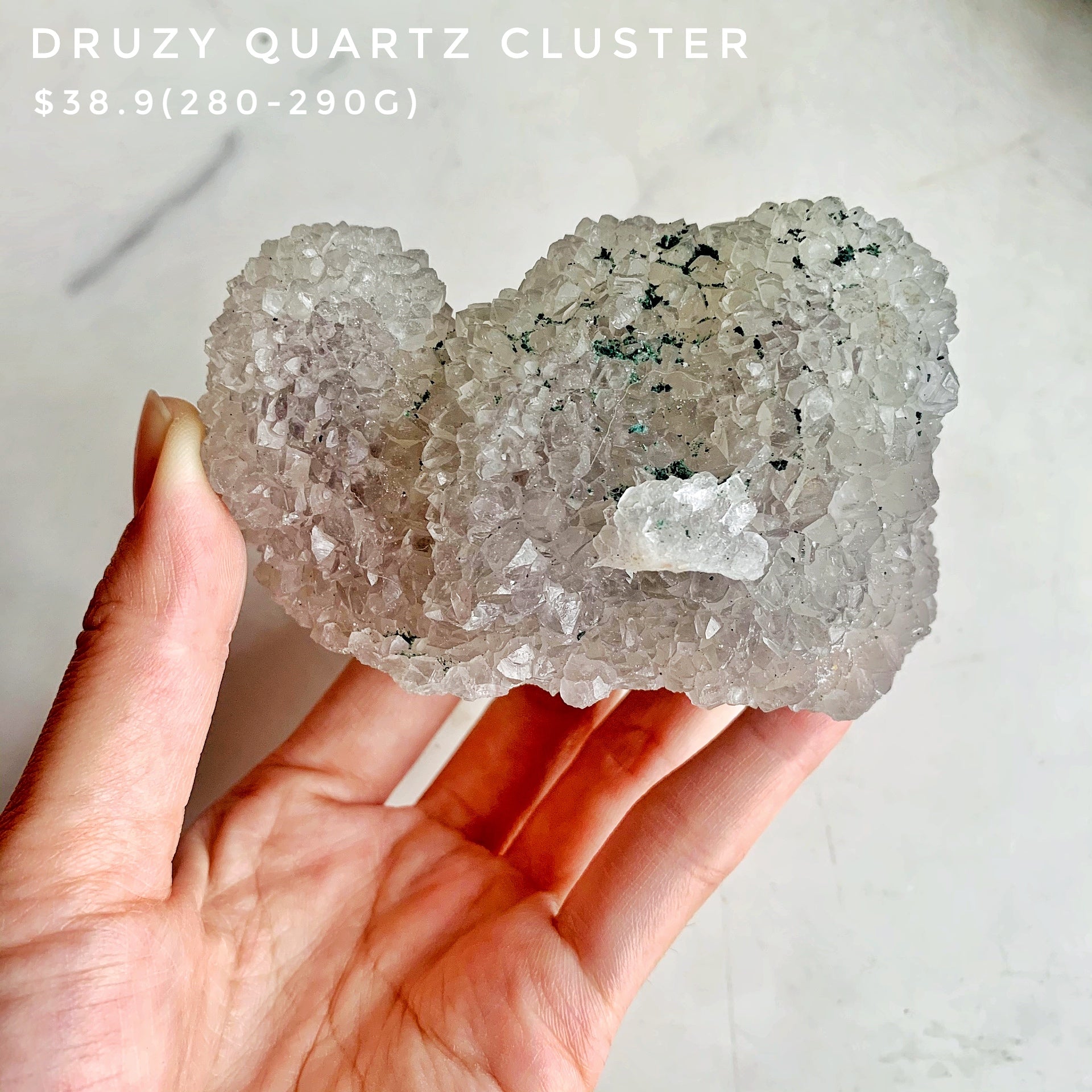 The twinkling druzy formations that can be seen on these clusters is something that is truly breath taking to behold. Quartz is the second most abundant mineral in Earth's continental crust, after feldspar. Extremely popular metaphysically, Clear Quartz is known as the "Master Healer" of the mineral kingdom. Its very high vibration gives it the most unique qualities among all the healing stone and crystals.
