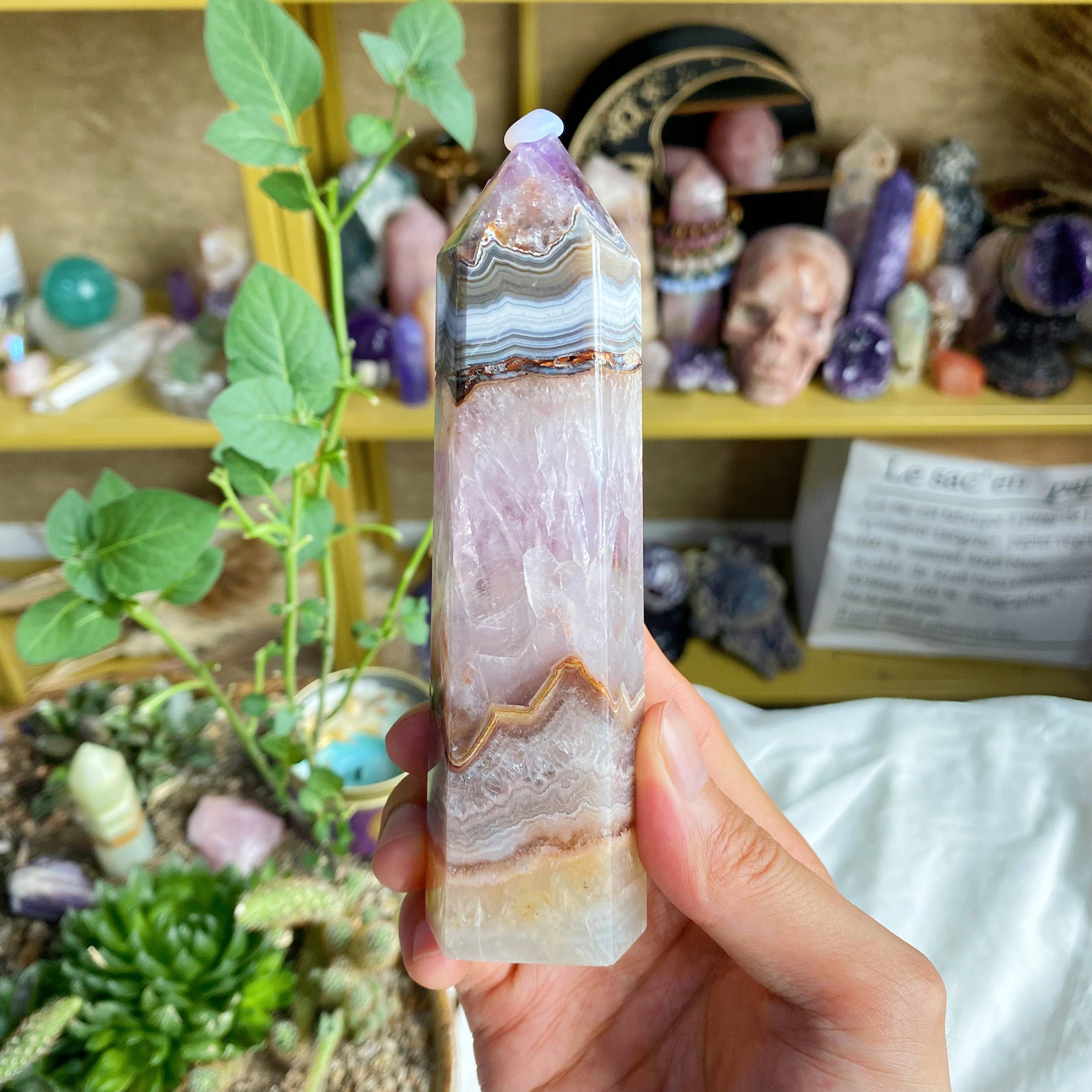 ► This exquisite Amethyst With Mexico Sardonyx Point is sure to stand out. This point is perfect for adding a special touch of beauty and elegance to your collection. With its lovely combination of purples, whites, and tans, this piece is sure to impress.